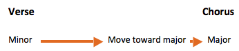The verse progression continues up until the double line, followed by a suggested chorus progression. Each verse progression, as the diagram above demonstrates, will start to reorient itself toward major as it gets close to the chorus.